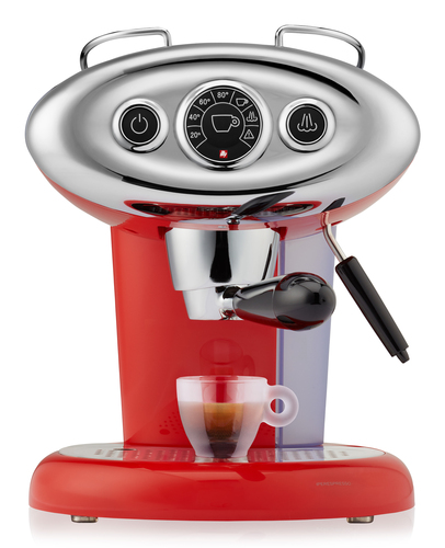 Macchina per espresso automatica in rosso e argento con montalatte integrato e tubo per vapore. Capacità tanica acqua: 1 L. Compatibile con capsule Illy. Spegnimento automatico dopo 30 min.