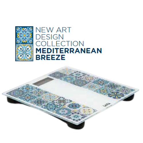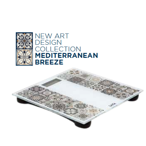 Bilancia pesapersona elettronica Laica, new art design collection Mediterranean Breeze, display LCD, pedana in vetro temperato 6 mm, divisione 100 gr, portata max 180 Kg, alimentazione batteria ricaricabile 3 V.