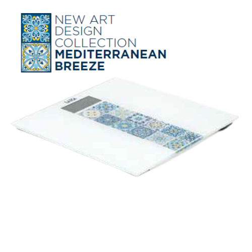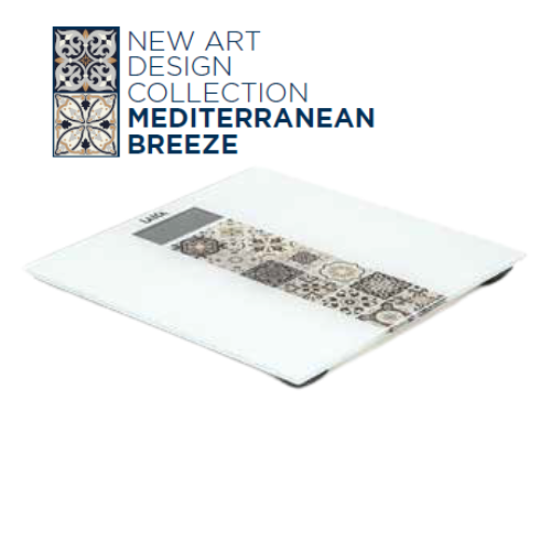 Bilancia pesapersona elettronica Laica, new art design collection Mediterranean Breeze, display LCD, pedana in vetro temperato 6 mm, divisione 100 gr, portata max 180 Kg, alimentazione batteria ricaricabile 3.7 V.