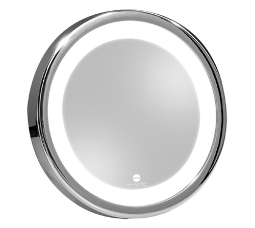Specchio rotondo con ingrandimento 7x e illuminazione LED. Montaggio a ventosa, ideale per uso interno e bagno. Alimentato da 4 batterie stilo AA, con cornice in cromo.