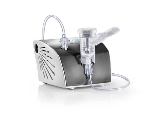 Aerosol ad aria compressa con vano porta accessori, in grado di nebulizzare anche i medicinali più viscosi. Completo di accessori e doccia nasale. Alimentazione da rete elettrica.