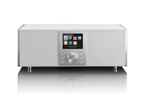 Radio personale con sintonizzatore DAB+ e FM, audio potente da 34 W, display TFT da 3.2" e connettività Wi-Fi e Bluetooth. Include sveglia, timer di spegnimento e telecomando. Design elegante in bianco.