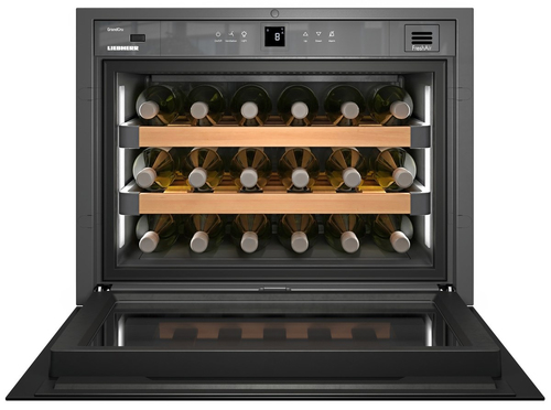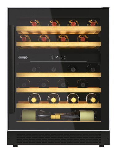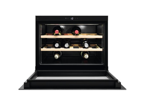 Elegante cantinetta vino sottopiano con capacità di 46 bottiglie. Struttura nera e interno in legno, dotata di display incorporato e classe climatica SN-T. Emissione acustica di 38 dB.