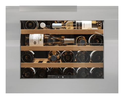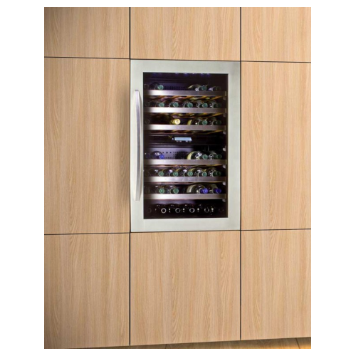 Elegante cantinetta vino da incasso in acciaio inox con capacità di 34 bottiglie e 2 zone di temperatura. Silenziosa (38 dB) e dotata di ventola integrata, display e filtro antracite. Consumo energetico di 0,535 kWh/24h.