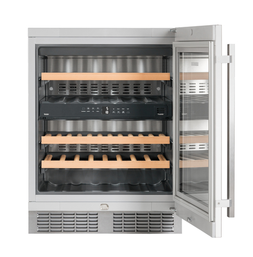 Elegante cantinetta vino da incasso in acciaio inox con interno nero. Capacità di 24 bottiglie, controllo touch e display LCD. Emissione acustica di 37 dB e consumo annuo di 100 kWh.