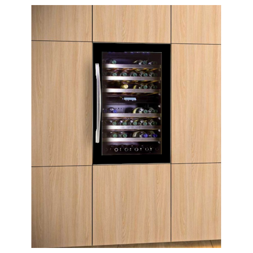 Cantina vino a incasso doppia temperatura +5°/+10°C e +10°/+18°C, porta in doppio vetro con modanatura in acciaio inox, illuminazione con luci LED, 5 ripiani di stoccaggio ed uno intermedio, capienza totale 42 bottiglie, 18 nella zona superiore e 24 in quella inferiore.