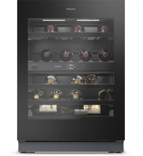 Enoteca da sottopiano KWTUS 7196 E Nero ossidiana vetro con zone temperatura separate, FlexiFrame e Push2open dal design compatto.