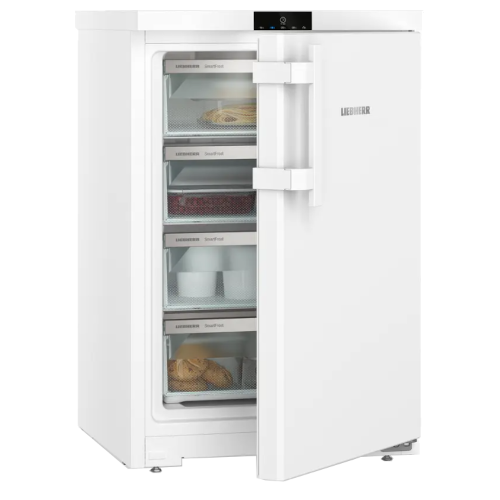 Congelatore da pavimento in bianco con capacità netta di 107 L. Sistema di raffreddamento statico e funzione SuperFrost per una congelazione veloce.
