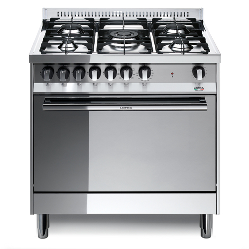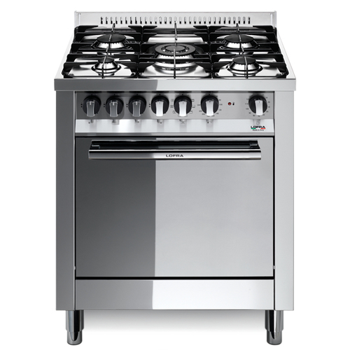 Cucina in acciaio inox con 5 fornelli a gas e forno elettrico da 94 L. Include bruciatore per padella wok, funzione grill e programmi automatici. Design elegante e prestazioni elevate per ogni esigenza culinaria.