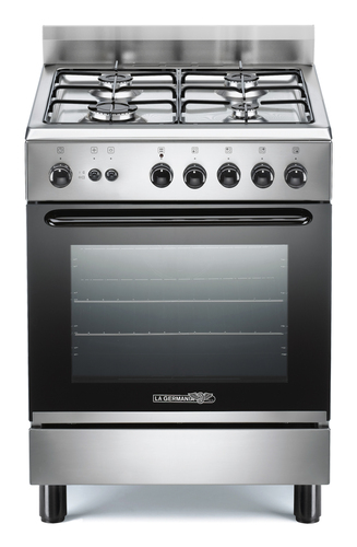 Cucina in acciaio inox con forno da 57 L e potenza grill di 2200 W. Design elegante con 4 fornelli a gas e griglia con ventola. Classe di efficienza energetica A e certificazione CE.