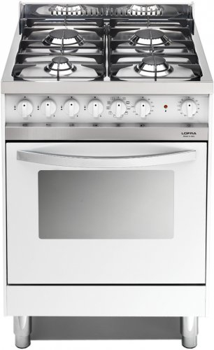 Cucina bianca con quattro fornelli a gas e forno elettrico da 53 L. Design ergonomico con manopole frontali e accensione elettronica.