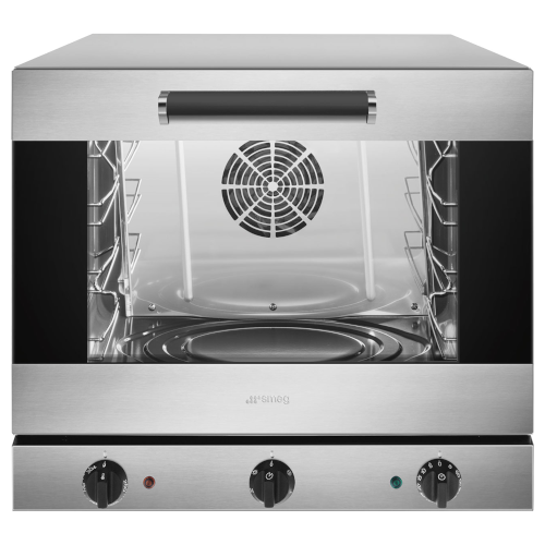 Forno predisposto per 4 teglie dimensioni 43.5x32, temperatura regolabile da 50 a 250 gradi, sistema di cottura a convezione, timer impostabile da 1 a 60 min o in modalita manuale, cavita interna 54.5 Lt