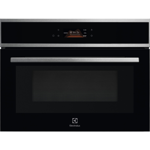 Microonde da incasso con 50 L di capacità e 1000 W di potenza. Design elegante in nero e acciaio inox, con display TFT e manopole retrattili. Funzione di scongelamento e partenza differita per una gestione ottimale del tempo in cucina.