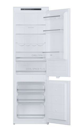 Frigorifero da incasso bianco con capacità netta di 244 L. Dotato di display incorporato, sistema No Frost, e classe climatica Starfish. Emissione acustica di 41 dB. Funzione Super Cool e portabottiglie inclusi.