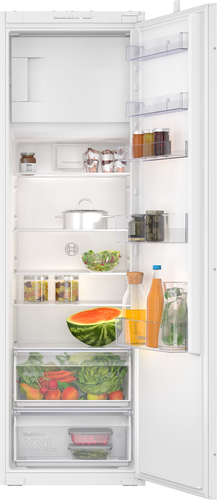 Frigorifero da incasso bianco con capacità netta di 188 L e classe climatica SN-T. Emissione acustica di 35 dB e sbrinamento automatico. Funzione Super Cool e congelatore da 14 L.