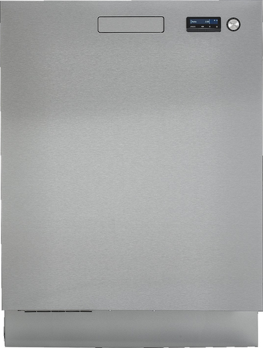 Lavastoviglie a scomparsa totale con design in acciaio inox e display LED.
