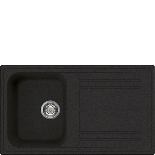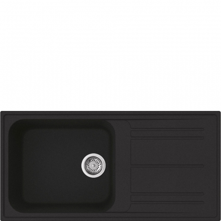 Lavello in granito nero montato su piano, con vasca rettangolare e scolapiatti reversibile. Dimensioni: 1000 x 500 mm.