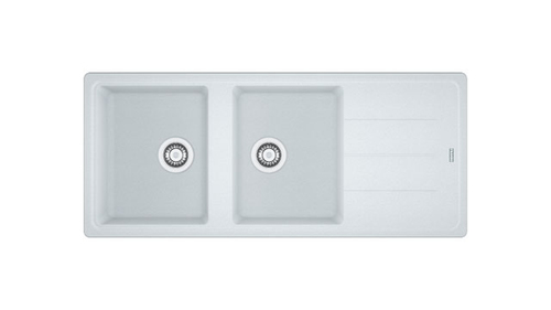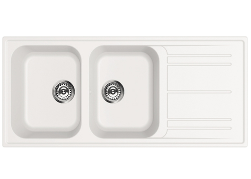 Lavello bianco con 2 ciotole e scolapiatti a destra. Dimensioni vasche: 340 x 420 mm, profondità 20 cm. Larghezza totale: 1160 mm.