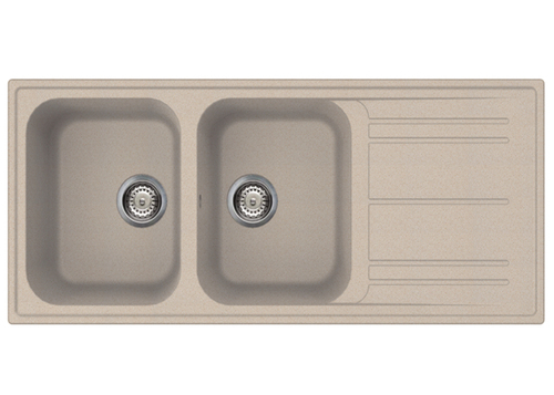 Lavandino sintetico color avena con 2 ciotole, dimensioni 330 x 420 mm e profondità 21 cm. Include scolapiatti a destra. Dimensioni totali: 1160 mm x 500 mm x 217 mm.