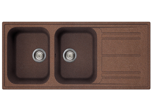 Lavandino in rame con 2 ciotole e scolapiatti a destra. Dimensioni: 1160 x 500 x 217 mm.