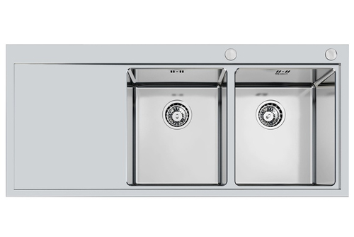 Lavello montato su piano in acciaio inox con due ciotole rettangolari. Dimensioni vasche: 340 x 400 mm, profondità 21 cm. Dotato di scolapiatti a sinistra e sistema di protezione contro il traboccamento. Larghezza totale: 1160 mm.