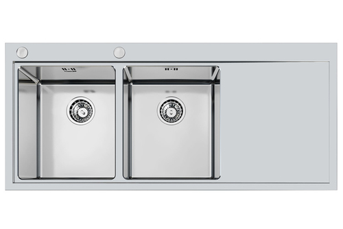 Lavello ad incasso in acciaio inox con due ciotole rettangolari, profondità di 21 cm e scolapiatti a destra. Dimensioni: 1160 mm x 500 mm x 220 mm.