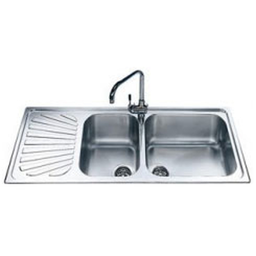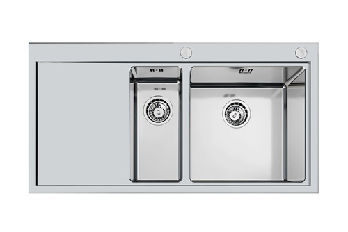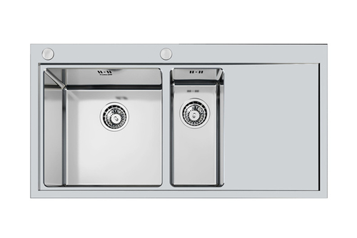 Lavello ad incasso in acciaio inox con due ciotole. Prima vasca: 440 x 400 mm, profondità 19,5 cm. Seconda vasca: 180 x 400 mm. Scolapiatti a sinistra. Dimensioni: 1000 x 520 mm.
