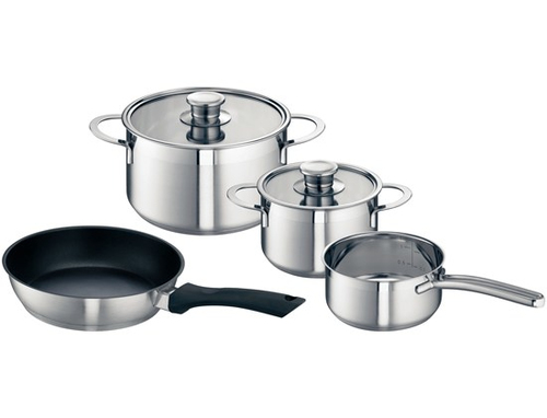 Set di pentole e padelle in cromo adatte per induzione. Include 3 pentole e 1 padella con coperchi in vetro. Rivestitura anti-aderente per una cottura facile e sana.