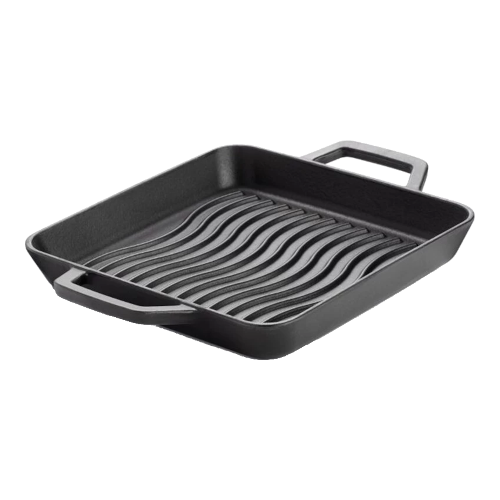 Teglia in ghisa quadrata, doppi manici, nervature in rilievo sul fondo.