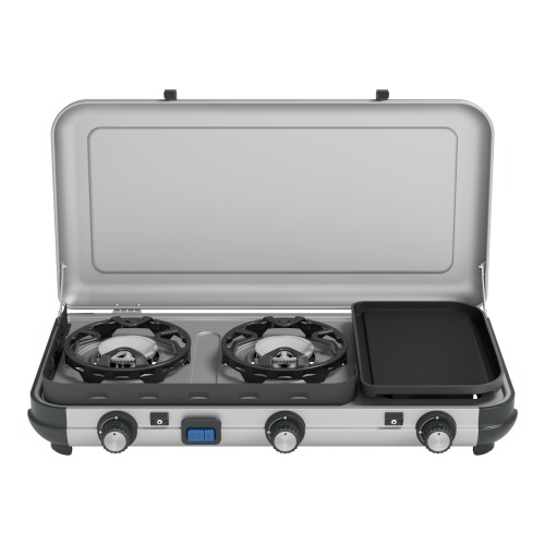 Fornello Camping Kitchen 2 Multi-Cook, 3 bruciatori a gas tubolari per cottura e grigliatura, coperchio di chiusura.