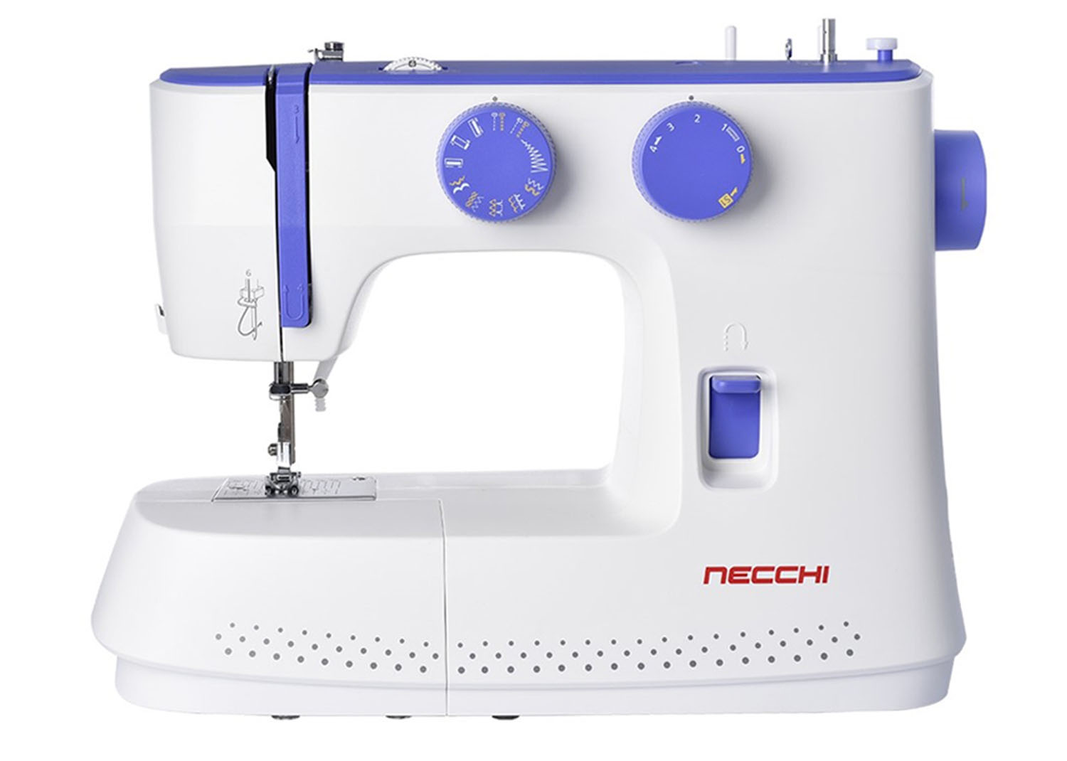 Macchina da cucire semiautomatica leggera (2,5 kg) con 11 schemi di cucito e braccio libero. Facile da usare grazie al controllo tramite leva e manopola. Sicurezza garantita con protezioni per le dita.