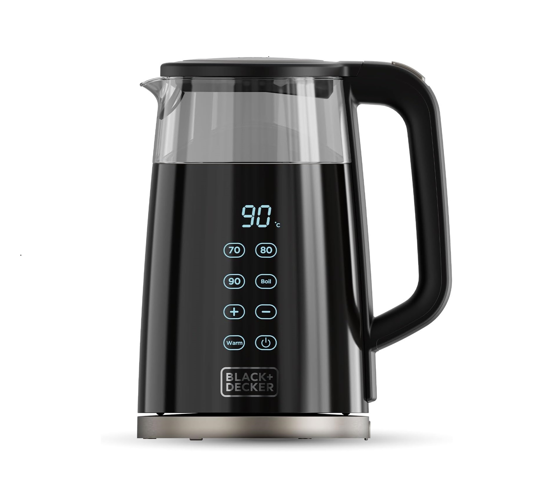 Bollitore elettrico con capacità di 1,5 L e termostato regolabile. Design nero e trasparente, dotato di indicatore del livello dell'acqua e funzione mantieni al caldo. Potenza di 2400 W, certificato CE.