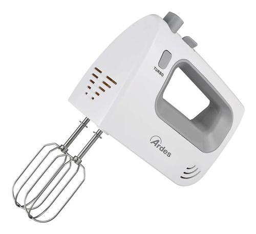 Sbattitore manuale bianco con 300 W di potenza e 5 velocità. Include fruste e gancio impastatore. Funzione Turbo per risultati rapidi.