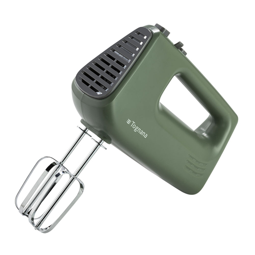 Sbattitore manuale verde con potenza di 400 W, 5 velocità variabili e funzione Turbo. Include fruste e gancio impastatore per un'ottima miscelazione e impasto.