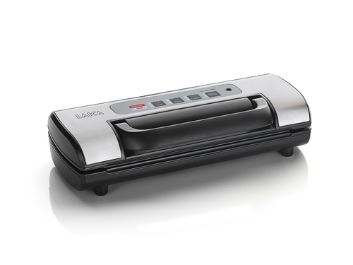 Macchina sottovuoto con sigillatura e potenza di 90 W. Livello massimo di vuoto di 600 mbar, design nero e argento, montabile a parete. Include rotolo sigillante e manuale.