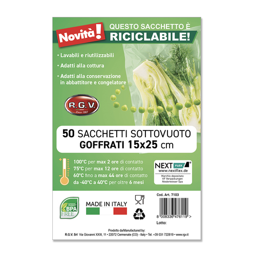Sacchetti per il sottovuoto a prova di frigo, 150 mm x 250 mm, confezione da 50 pz, senza BPA, made in Italy.