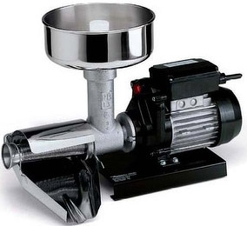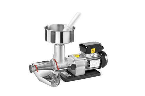 Spremi pomodoro elettrico SUGO MO/MO, potenza 150W, corpo in ghisa stagnata, coclea spremitrice in nylon, tramoggia e collettore in Moplen, filtro in acciaio inox con fori diametro 1.5mm.