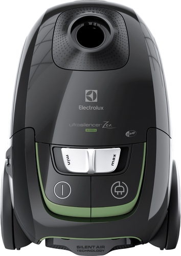 Aspirapolvere A cilindro in nero e verde, potenza massima di 650 W e consumo annuo di 24,4 kWh. Capacità del contenitore di 3,5 L e raggio d'azione di 12 m. Dotato di controllo elettronico, indicatore polvere piena e dispositivo di avvolgimento cavo. Eco-friendly e silenzioso con 58 dB.