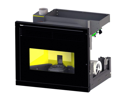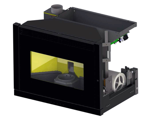 Inserto a pellet COMFORT P85, ventilato, radiocomando palmare multifunzione, focolare e braciere in ghisa, potenza termica nominale 12 kW, volume riscaldabile 344 mc.
