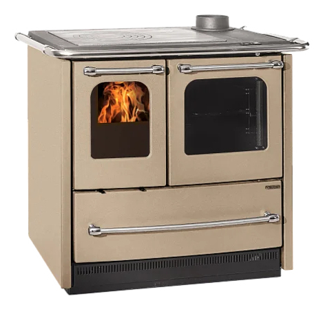 Cucina a legna FAMILY 4,5 con rivestimento in acciaio porcellanato Cappuccino, forno smaltato da 41 lt., cassettone portalegna, classe energetica A, volume riscaldabile 258 m³, potenza termica nominale 9,0 kW