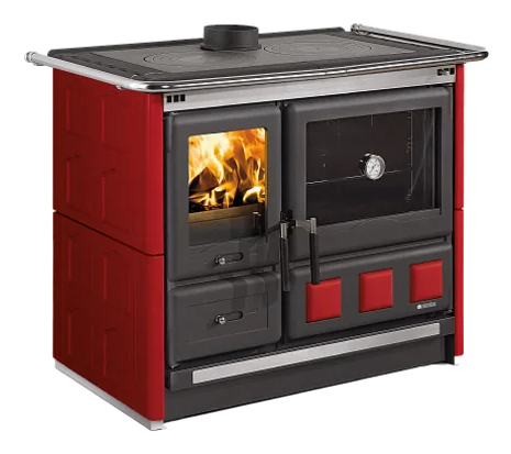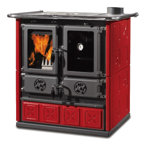 Cucina a legna ROSETTA 5.0 VST Ceramica Liberty Bordeaux, focolare in ghisa, sistema di post-combustione, forno smaltato da 28lt, porta forno in vetro ceramico, potenza termica nominale 7,2 kW, volume riscaldabile 206 mc.
