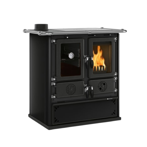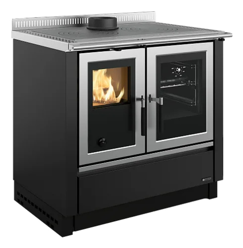 Cucina ROSA L 5.0 VST Steel Nero Antracite, focolare in refrattario e ghisa, sistema di post-combustione, forno in acciaio smaltato porcellanato da 55L, potenza termica 9.5 Kw, volume riscaldabile 272 mc.