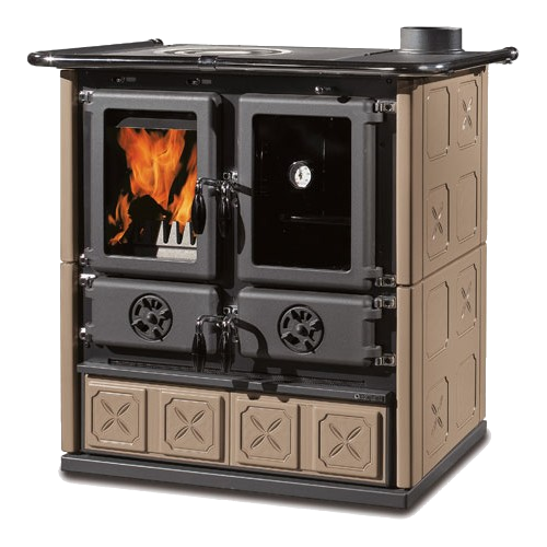 Cucina a legna FAMILY 4,5, Caramello, focolare in ghisa, sistema di post-combustione, porta forno con doppio vetro, potenza nominale 7,5 kW, volume riscaldabile 215 mc, classe ambientale 4 stelle.