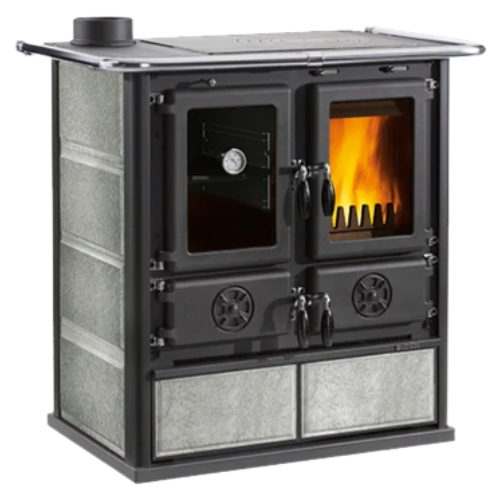 Cucina a legna ROSETTA 5.0 VST Pietra Naturale, focolare in ghisa, sistema di post-combustione, forno smaltato da 28lt, porta forno in vetro ceramico, potenza termica nominale 7,2 kW, volume riscaldabile 206 mc.