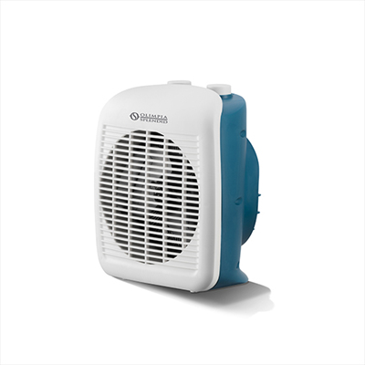 Riscaldatore ambiente elettrico con ventilatore, potenza termica da 1000 W a 2000 W, adatto per stanze fino a 60 m³. Sicuro e pratico, con protezione anti-ribaltamento e termostato meccanico. Design compatto e colori blu e bianco.