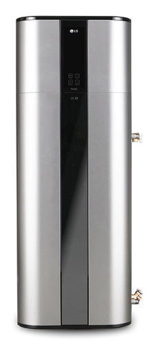 Scaldacqua a pompa di calore inverter LG monoblocco a basamento dal Design moderno, con bollitore da 270lt per produzione di acqua calda sanitaria.