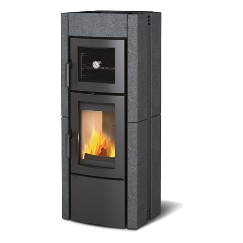 Stufa a legna ESTER FORNO EVO Pietra Vulcan, focolare in ghisa-nordiker con post combustione, potenza termica 8.2 kW, porta in ghisa smaltata e vetro ceramico, forno in acciaio smaltato porcellanato, volume riscaldabile 235 mc.
