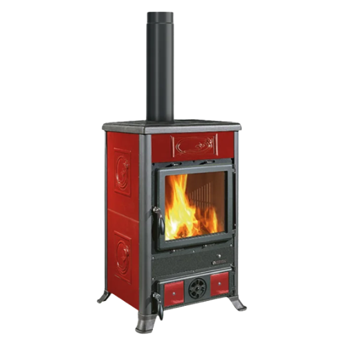 Stufa a legna ROSSELLA R1.16 CERAMICA, Liberty Bordeaux, focolare in ghisa, classe ambientale 5 stelle, potenza nominale 9 kW, sistema post-combustione, vetro ceramico, cassetto cenere, volume riscaldabile 258 mc.