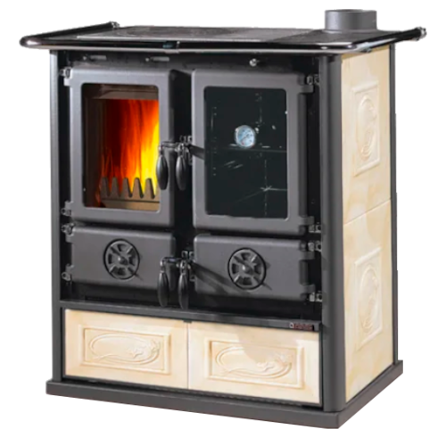 Stufa a legna 7,9 Kw nominali, rendimento 86 su cento, 5 stelle, dotata di forno e piano radiante adatto anche a cucinare, finiture in ceramica Liberty Panna, focolare in Ghisa, scarico fumi 130mm, m3 riscaldabili fino a 227, consumo 2.1 Kg/ora,
